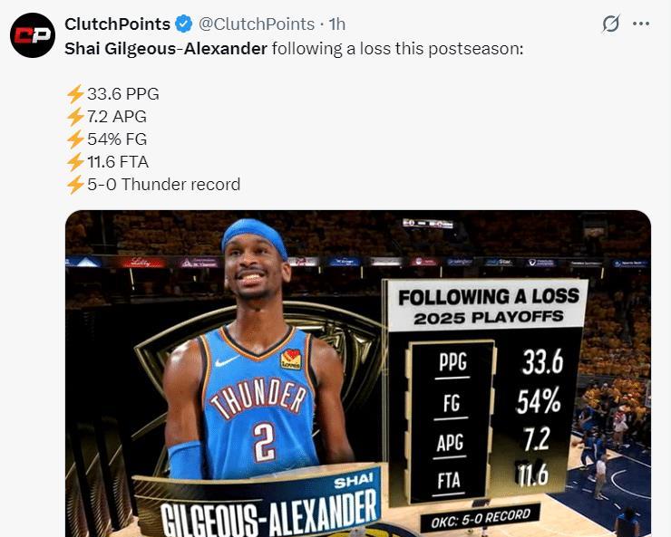 赛前美媒给出,在季后赛SGA失利后的下一场,场均33.6分7.2助攻,命中率54%,战绩是5胜0负。